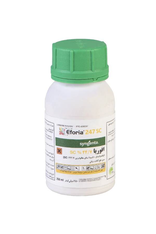 حشرهکش افوریا (Eforia) یک حشرهکش قوی سیستمیک با خاصیت تماسی و گوارشی به منظور کنترل آفات در گیاهان است. افوریا حاوی دو ماده موثر تیامتوکسام و لامبدا سایهالوترین با تکنولوژی زئون است. افوریا به دلیل فعالیت سیستمیک قوی و قابلیت کنترلی که این سم بر روی حشرات مکیدنی دارد، مناسب استفاده در گیاهانی همچون پسته، کاکائو، سویا، سبزیجات و گیاهان گرمسیری است. افوریا روی لارو آفات پروانهای برگخوار مانند بید گوجه فرنگی، حشرات مکنده مثل شتهها، زنجرکها، پسیلها و تریپس موثر است. حشره کش افوریا تاثیر ضربهای در کنترل آفات دارد و دارای خاصیت نفوذ سریع به داخل گیاه و تاثیر سیستمیک بالا است. این حشره کش با داشتن دو نحوه اثر متفاوت ضمن حفاظت گیاه از بیرون و درون، بروز مقاومت را به تاخیر میاندازد. افوریا ایمن، کم خطر و سازگار با محیط زیست است. دوره کارنس آن 3 روز است. زمانی که سم را استفاده میکنید از روز سمپاشی تا سه روز بعد نمیتوانید محصول را برداشت کنید.